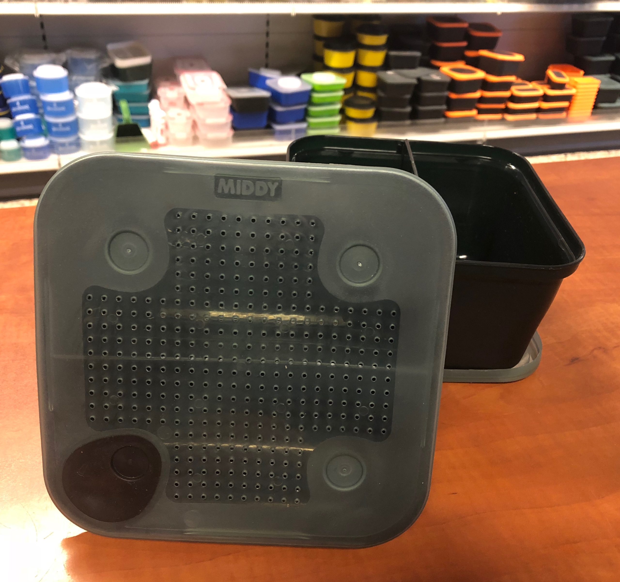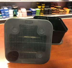 Groene aasdoos met een geperforeerd deksel met handige sluiting. Sluit perfect af.