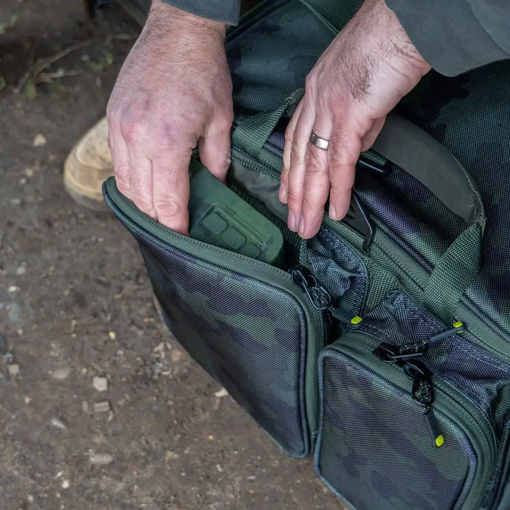 De RidgeMonkey Ruggage Vistas Large heeft een inhoud van 65 liter in het hoofdcompartiment, met de mogelijkheid om deze ruimte op te delen indien nodig. De Vistas heeft vijf externe zakken met dubbele ritssluiting, samen met interne gaaszakken met ritssluiting voor kleinere hengelspullen.